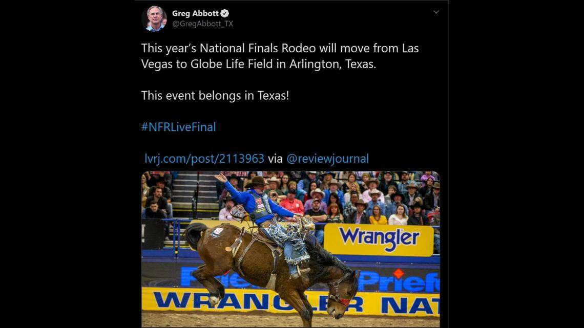 “We are proud to welcome the Wrangler National Finals Rodeo, showcasing the very best competitors and livestock in the world, back to the Lone Star State,” Abbott said in the release. “Western sports have long been part of the Texas brand, and Texas fans will be thrilled to see these competitors back in the saddle after being bucked off by COVID-19. Texas is committed to working alongside our communities to ensure they have the tools needed to spur tourism, and grow jobs and their local economies. I congratulate the PRCA on selecting Arlington and Fort Worth, and on coming back home to Texas where the very first NFR was held.”