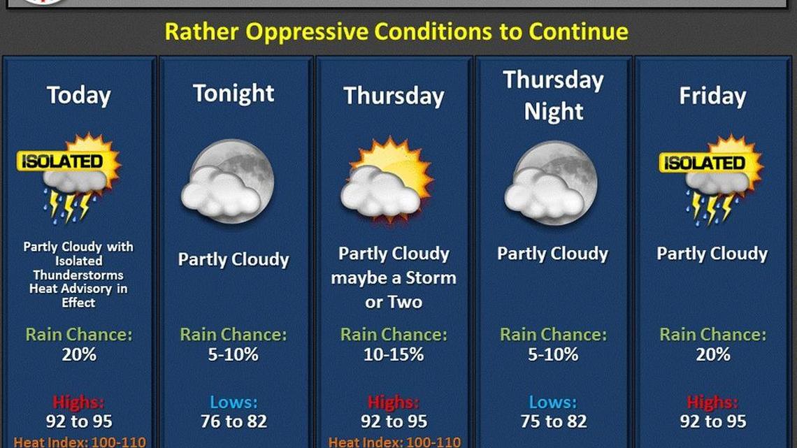 Highs in the low to mid-90s are forecast through the weekend, with lows struggling to get below 80. And heavy moisture in the air will keep a 20 percent chance of afternoon storms for the near future.